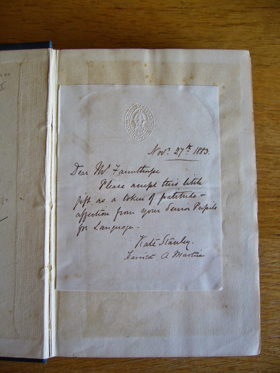 Kate Stanley was one of the two signatories of the 1883 note to Rev Faunthorpe “from your Senior Pupils for Language”. This suggests that she herself was, with Harriet A Martin, a “Senior Pupil”. In fact, she was at this time Principal Faunthorpe’s most senior member of staff.