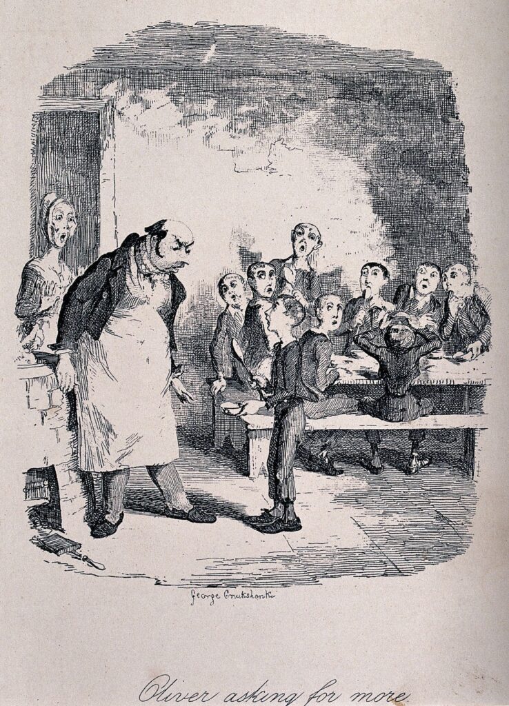 Oliver Twist, holding a bowl and a spoon, asks for more food, while other children and a woman look surprised. Etching by George Cruikshank, Wellcome Collection, Public Domain
